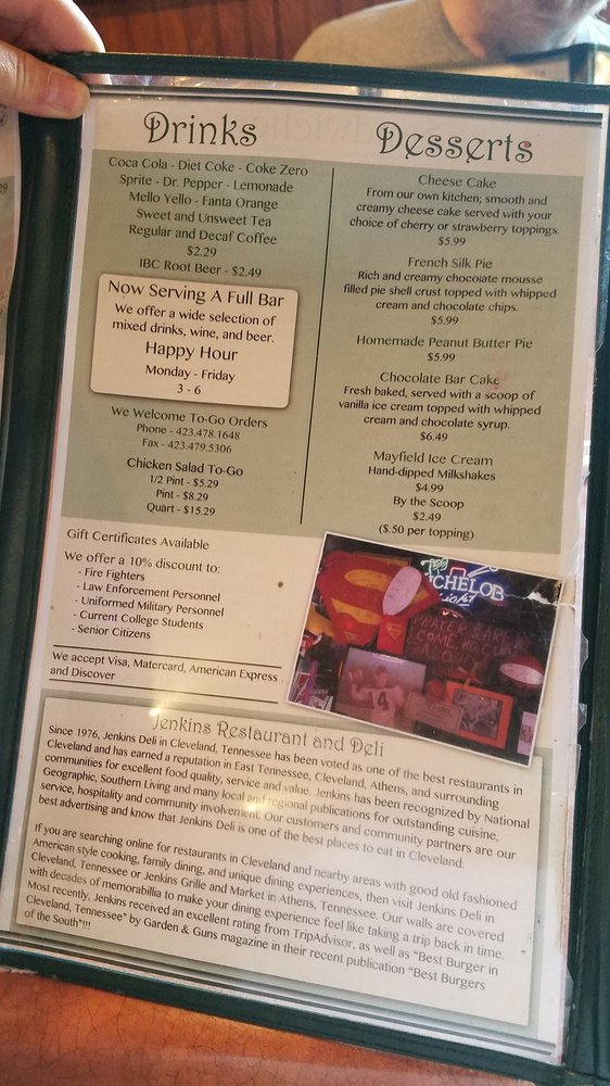 Jenkins Deli, located in Cleveland, TN, is a trendy and casual deli offering a wide range of American and seafood dishes. With options for takeout, reservations, delivery, and catering, this spot is perfect for groups, families, and even those with furry friends. The menu boasts a famous chicken salad sandwich, BLT, fried pickles, and chicken and rice soup that are all guaranteed to be flavor explosions. Customers rave about the friendly atmosphere, great service, and delicious food, making it a must-visit spot in the area. Whether you're looking for a quick lunch or a relaxing dinner, Jenkins Deli has something for everyone to enjoy.